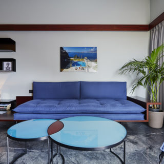 Αντίστοιχα, στο εσωτερικό των περιπτέρων χρησιμοποιήθηκαν φυσικά υλικά με αδρές υφές και κυρίως ξύλο με βαθιά νερά, υπόλευκη και μπεζ πέτρα, φυσική γιούτα και μεταλλικές στιλπνές λεπτομέρειες, «συνθέτοντας έναν καμβά που εντάσσεται αρμονικά στο άγριο τοπίο της περιοχής».