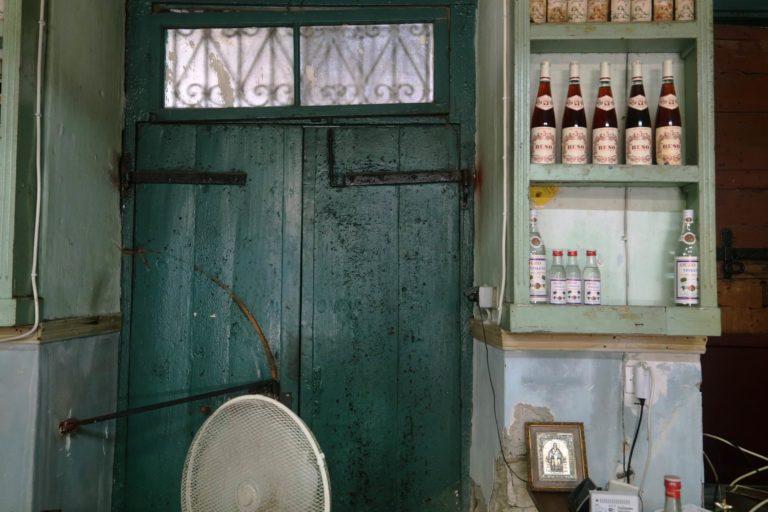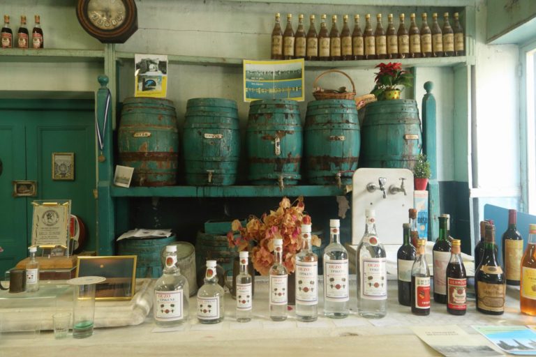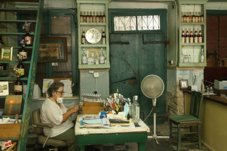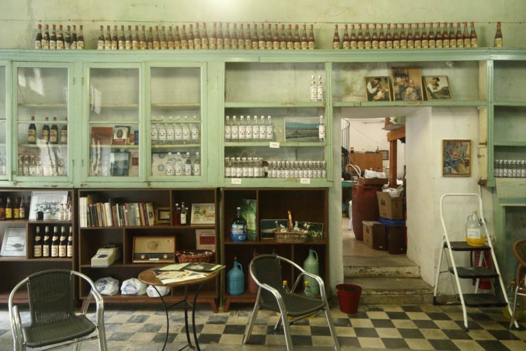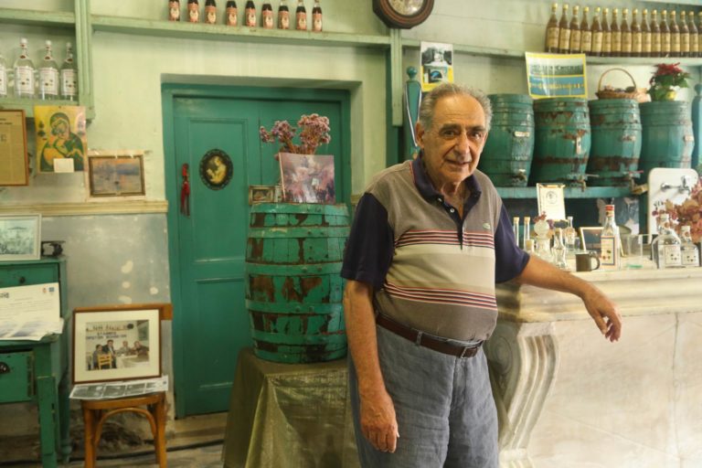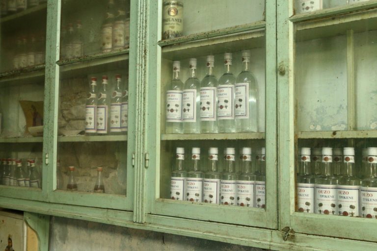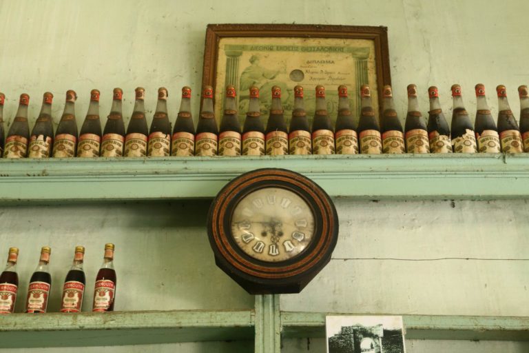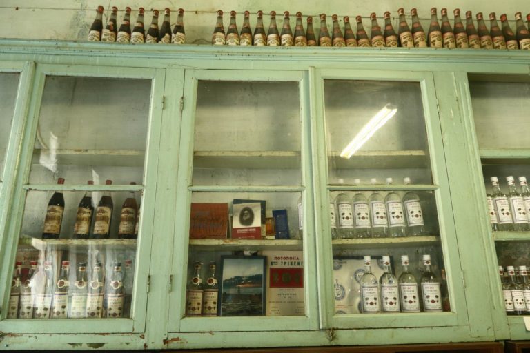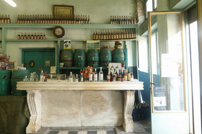 Παλιά βαρέλια και προθήκες που θυμίζουν μιαν άλλη εποχή βρίσκονται περιμετρικά στους τοίχους του μαγαζιού. Όταν κάποιος μπαίνει μέσα, η μυρωδιά του ούζου διαπερνά τις αισθήσεις του, ενώ κοιτάζοντας το παλιό ξύλινο ρολόι στον τοίχο, φαίνεται σαν οι δείκτες του να τρέχουν προς τα πίσω και τότε ο χρόνος μετατρέπεται για λίγο σε μια τρυφερή αναπόληση της ζωής της πόλης σε ξεθωριασμένα χρώματα γαλάζια.
