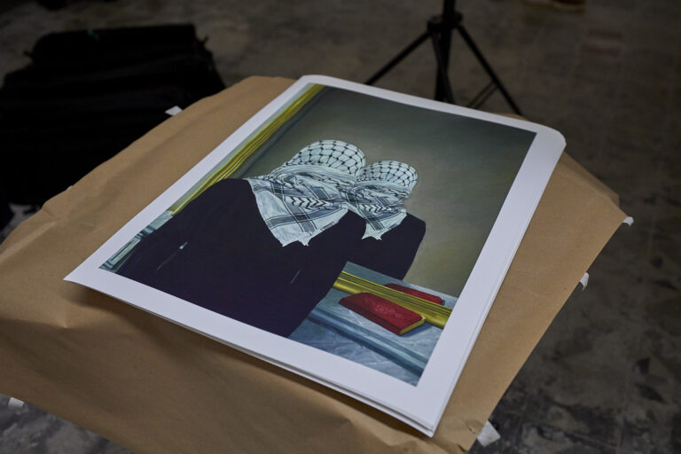 Το βλέμμα του Shadi Alzaqzouq εστιάζει επίσης σε έναν προσωπικό εσωτερικό χώρο. Απεικονίζει τον εαυτό του σε αυτήν τη συγκλονιστική αυτοπροσωπογραφία, απασχολημένος με τη γαλήνια πράξη της ανάγνωσης του Κορανίου, με την πανκ μοϊκάνα του να αψηφά τις προσδοκίες, ενώ οι ισχυροί του κόσμου εξαπολύουν το χάος μέσα στον πίνακα που κρέμεται στον τοίχο του δωματίου του.