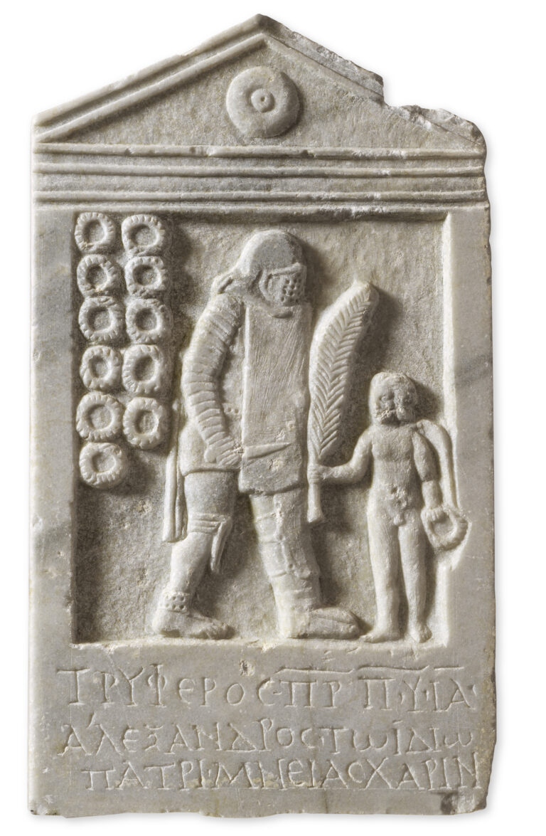 Μαρμάρινη επιτύμβια στήλη του μονομάχου Τρύφερου, την οποία προσέφερε στη μνήμη του ο γιος του Αλέξανδρος. Ο μονομάχος βαριά οπλισμένος, στον τύπο του διώκτη, στρέφεται προς τα δεξιά. Αριστερά της παράστασης, έντεκα στεφάνια συμβολίζουν τις νίκες του στον στίβο. Πάτρα, Βόρειο νεκροταφείο, 2ος-3ος αι. μ.Χ.