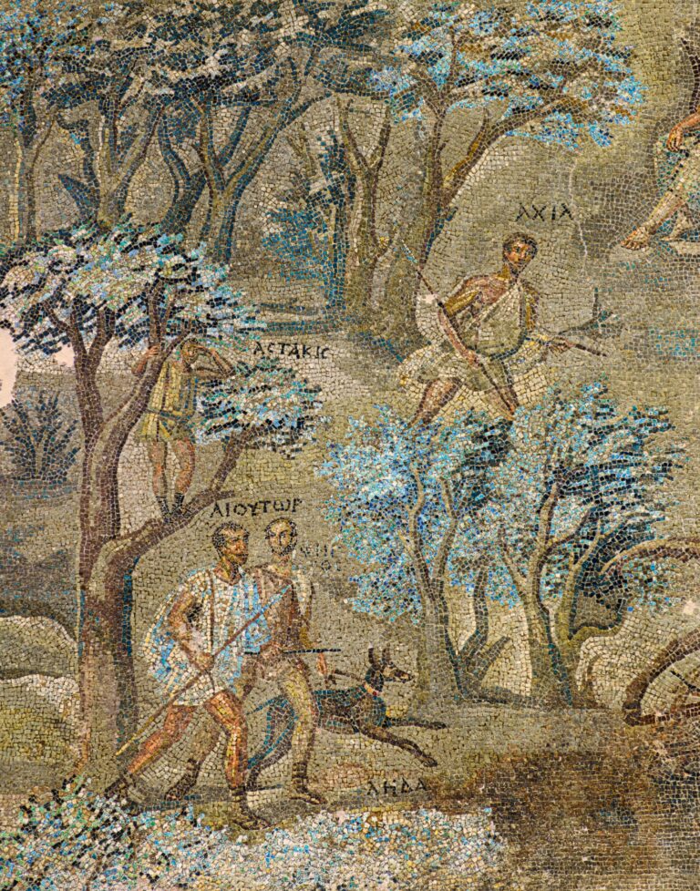 Ψηφιδωτό δάπεδο μεγάλης και πλούσιας ρωμαϊκής έπαυλης από τα μεγαλύτερα που έχουν εντοπιστεί στην Πάτρα. Στην παράσταση - με θέμα το κυνήγι - έχουν χρησιμοποιηθεί πολύ λεπτές ψηφίδες που ανακαλούν ζωγραφική σύνθεση, ενώ οι επιγραφές ονομάτων πιστοποιούν ότι πρόκειται για ρεαλιστική σκηνή. Έργο υψηλής καλλιτεχνικής αξίας από αξιόλογους τεχνίτες. Τέλη του 3ου - αρχές του 4ου αι. π.Χ.