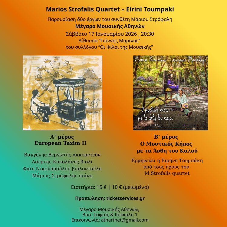 Ο Μάριος Στρόφαλης με το κουαρτέτο του και την Ειρήνη Τουμπάκη μας προσκαλούν το Σάββατο 17 Ιανουαρίου στο Μέγαρο Μουσικής Αθηνών στην αίθουσα "Γιάννης Μαρίνος" του συλλόγου "Οι Φίλοι της Μουσικής"! Η συναυλία τους αποτελείται από δύο μέρη. Στο πρώτο μέρος παρουσιάζουν τον κύκλο σύγχρονης μουσικής δωματίου με τίτλο «European Taxim II» ενώ στο δεύτερο μέρος τη συλλογή τραγουδιών με τίτλο «Ο μυστικός κήπος με τα άνθη του καλού».