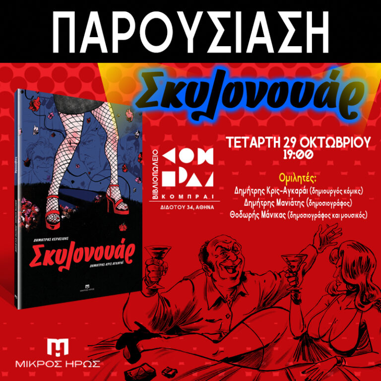 Οι εκδόσεις Μικρός Ήρως σας προσκαλούν την Τετάρτη 29 Οκτωβρίου, στο βιβλιοπωλείο Κομπραί για την μεγάλη παρουσίαση του graphic novel Σκυλονουάρ των Δημήτρη Κερασίδη και Δημήτρη Κρις-Αγκαράι! Ένα graphic novel που καταπιάνεται με τη δεκαετία του ‘80, δηλαδή τη δεκαετία των σημαντικών ιδεολογικών ανακατατάξεων στους τρόπους πρόσληψης του λεγόμενου «λαϊκού» τραγουδιού, αλλά και της απομυθοποίησης του πολιτικού τραγουδιού.