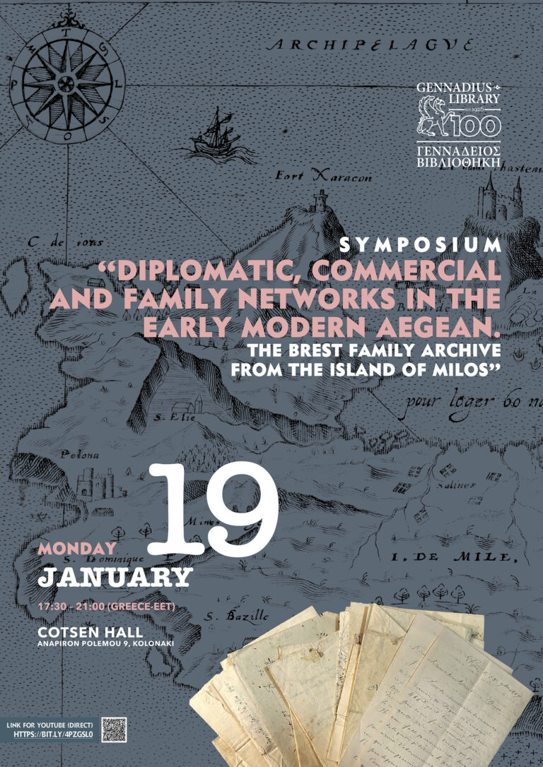 Με αφορμή τα 100 χρόνια από την ίδρυσή της, η Γεννάδειος Βιβλιοθήκη διοργανώνει συνέδριο για τα διπλωματικά, εμπορικά και οικογενειακά δίκτυα στο Αιγαίο, με επίκεντρο το αρχείο της οικογένειας Μπρεστ από τη Μήλο.