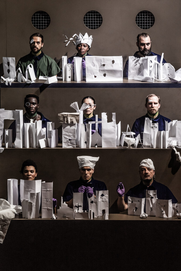 Πράγματι, το Κακό σε όλες του τις μορφές ανεβαίνει στη σκηνή, ενσαρκωμένο από μια σειρά πλάσματα, που εμφανίζονται ως κρατούμενοι σε κατατονική κατάσταση, καθισμένοι σε ένα εδώλιο σαν δικαστές, σε μια δίκη που τιμωρεί και καταδικάζει κάθε παρατυπία.