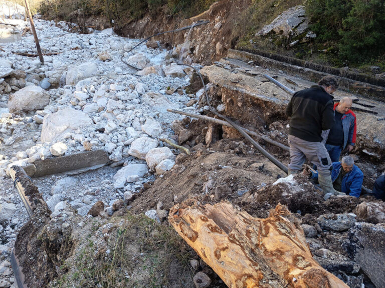Συνεργεία επισκευάζουν ζημίες μετά τις καταστροφές λόγω των ισχυρών βροχοπτώσεων στα Τζουμέρκα, Δευτέρα 24 Νοεμβρίου 2025. ΑΠΕ-ΜΠΕ/ΑΠΕ-ΜΠΕ/ΜΑΙΡΗ ΤΖΩΡΑ