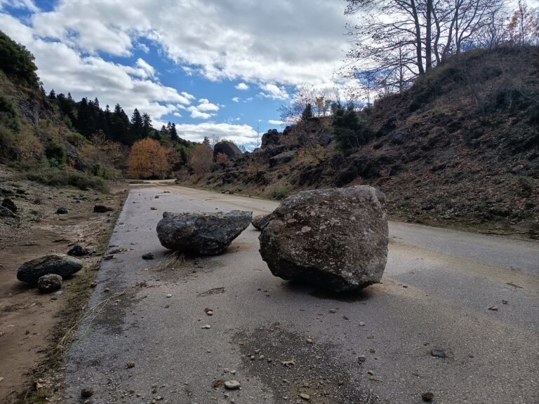 Βράχια και πέτρες έχουν πέσει σε δρόμο μετά τις καταστροφές λόγω των ισχυρών βροχοπτώσεων στα Τζουμέρκα, Δευτέρα 24 Νοεμβρίου 2025. ΑΠΕ-ΜΠΕ/ΜΑΙΡΗ ΤΖΩΡΑ