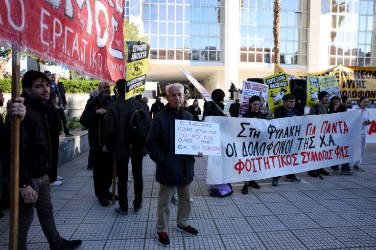 Κόσμος συμμετέχει σε αντιφασιστικό συλλαλητήριο, έξω από το Εφετείο Αθηνών, ενώ σήμερα αναμένεται η πρόταση της εισαγγελέως στη δίκη σε δεύτερο βαθμό για την υπόθεση της εγκληματικής οργάνωσης «Χρυσή Αυγή», Αθήνα, Παρασκευή 12 Δεκεμβρίου 2025. ΑΠΕ-ΜΠΕ/ΓΙΩΡΓΟΣ ΒΙΤΣΑΡΑΣ