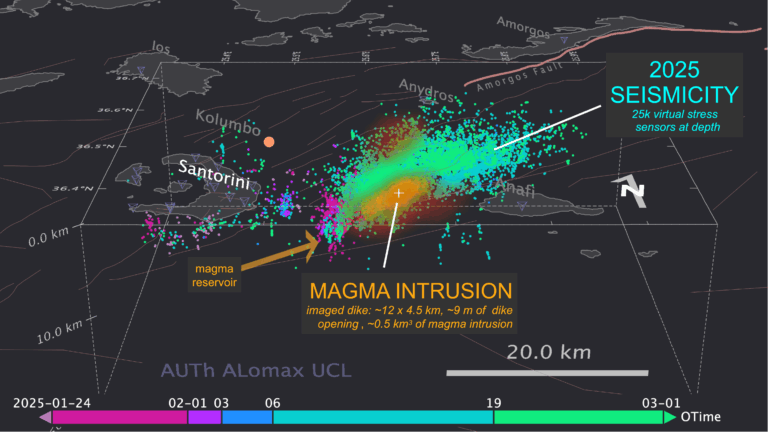Διεθνής ομάδα ερευνητών, ανάμεσα τους και Έλληνες, αποκάλυψε τις κρυφές διεργασίες που οδήγησαν στην ιδιαίτερα ενεργή σεισμική δραστηριότητα κοντά στη Σαντορίνη στις αρχές του 2025. Η μελέτη τους, που δημοσιεύτηκε στο περιοδικό Science, δείχνει ότι η δραστηριότητα προκλήθηκε από μια τεράστια μαγματική διείσδυση - ένα κατακόρυφο στρώμα μάγματος - που διαδόθηκε κατά κύματα σε απόσταση μεγαλύτερη από 20 χιλιόμετρα μέσα στο φλοιό της Γης σε βάθος μεγαλύτερο από 10 χιλιόμετρα κάτω από τον πυθμένα της θάλασσας.