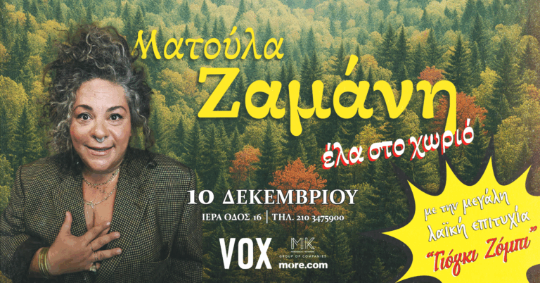 Η Ματούλα Ζαμάνη επιστρέφει στη σκηνή του VOX για μια μοναδική εμφάνιση την Τετάρτη 10 Δεκεμβρίου, παρουσιάζοντας τη νέα της μουσική παράσταση με τίτλο «Έλα στο χωριό».