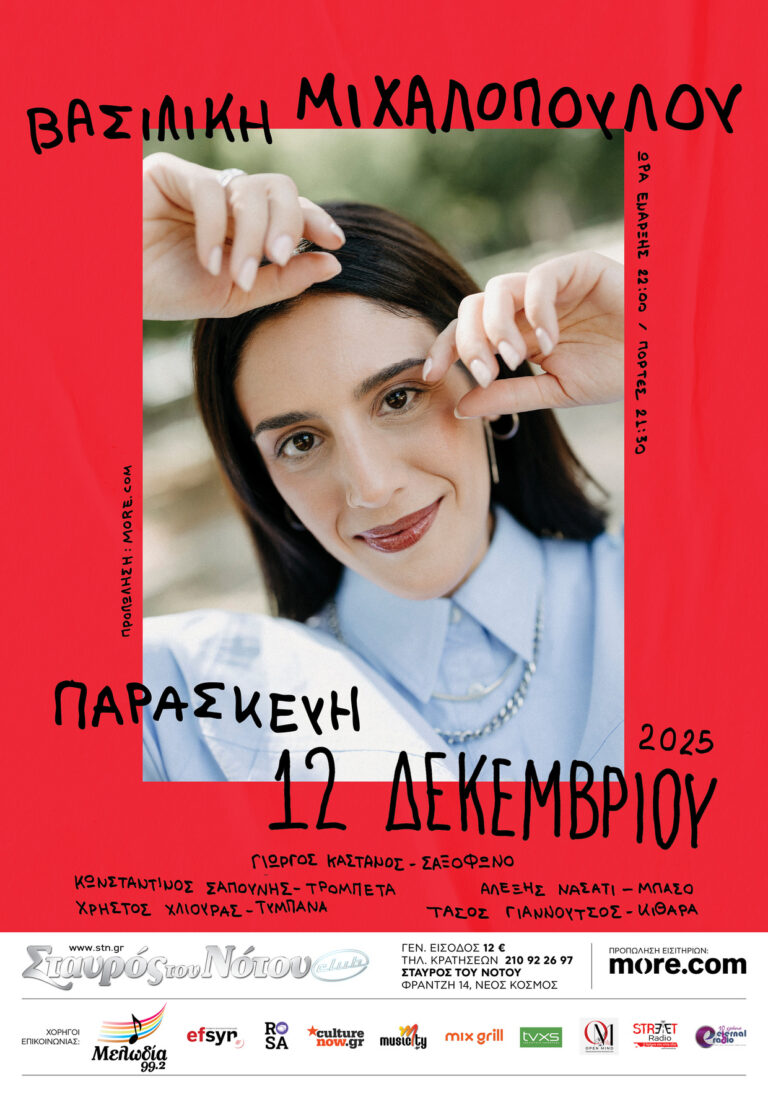 Η Βασιλική Μιχαλοπούλου συνεχίζει τις επιτυχημένες της εμφανίσεις στον Σταυρό του Νότου Club και δίνει νέο ραντεβού την Παρασκευή 12 Δεκεμβρίου! Με την εκρηκτική της μπάντα και ανανεωμένο ρεπερτόριο είναι έτοιμη να ξεσηκώσει το κοινό με τα τραγούδια και την δυναμική της ενέργεια στη σκηνή.