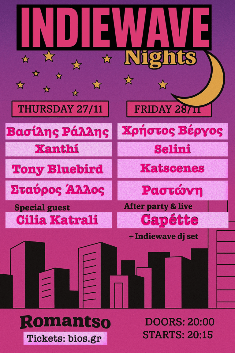 Το Indiewave σας προσκαλεί σε δύο νύχτες γεμάτες indie και alternative ήχους με ανερχόμενα ονόματα της εγχώριας μουσικής σκηνής. Μια μοναδική μουσική εμπειρία σε ένα χώρο με έντονη καλλιτεχνική ατμόσφαιρα στην καρδιά της Αθήνας.