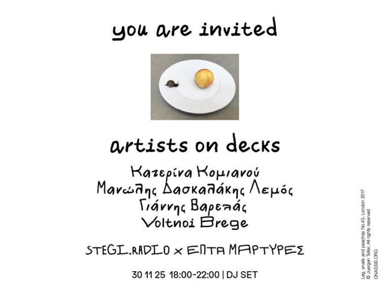 Το DJ session “you are invited: artists on decks” πραγματοποιείται σε συνεργασία με το STEGI.RADIO και το wine bar "Επτά Μάρτυρες", στο πλαίσιο της έκθεσης του Juergen Teller στο Onassis Ready.