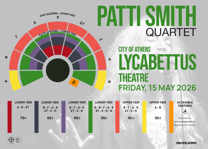 Ακολουθώντας έναν ειδικά σχεδιασμένο σκηνικό προσανατολισμό, η μπάντα θα εμφανιστεί από το κέντρο του θεάτρου, στον κυκλικό χώρο της ορχήστρας - εκεί που κάποτε στεκόταν ο χορός της αρχαίας τραγωδίας. Αυτή η επιλογή δεν είναι μόνο αισθητική - είναι βαθιά συμβολική. Μετατοπίζοντας τη μουσική στην καρδιά του χώρου, καταργείται κάθε νοητό σύνορο ανάμεσα στους μουσικούς και το κοινό. Η Patti Smith, σαν ποιήτρια-ιεροφάντης, θα σταθεί μια ανάσα από τους θεατές, προσκαλώντας τους σε έναν κοινό παλμό, μια ζωντανή κυκλική εμπειρία χωρίς αρχή και τέλος.