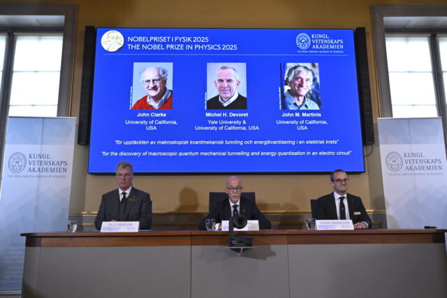 Οι επιστήμονες Τζον Κλαρκ, Μισέλ Ντεβορέ και Τζον Μαρτίνις τιμήθηκαν με το βραβείο Νόμπελ Φυσικής 2025 για «την ανακάλυψη της μακροσκοπικής κβαντομηχανικής σήραγγας και της κβαντοποίησης της ενέργειας σε ένα ηλεκτρικό κύκλωμα», ανακοίνωσε η επιτροπή Νόμπελ.