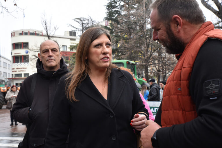 Η πρόεδρος της Πλεύσης Ελευθερίας Ζωή Κωνσταντοπούλου συνομιλεί με αγρότες που πραγματοποιούν συγκέντρωση στην κεντρική πλατεία της Λάρισας, την Παρασκευή 23 Ιανουαρίου 2026. Στη Λάρισα βρίσκεται η Ζωή Κωνσταντοπούλου καθώς συνεχίζεται η δίκη στο Μονομελές Πλημμελειοδικείο Λάρισας για το βιντεοληπτικό υλικό της εμπορικής αμαξοστοιχίας της τραγωδίας των Τεμπών. ΑΠΕ-ΜΠΕ/ ΑΠΕ-ΜΠΕ/ΑΠΟΣΤΟΛΟΣ ΝΤΟΜΑΛΗΣ