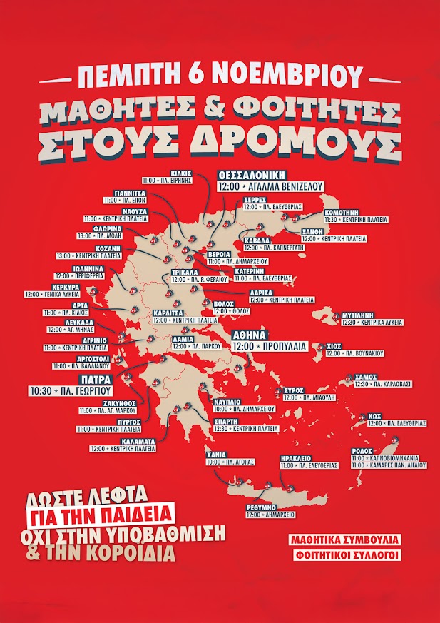 Γι’ αυτούς τους λόγους οι Φοιτητικοί Σύλλογοι που συνυπογράφουμε το κοινό αυτό ψήφισμα παίρνουμε την πρωτοβουλία να οργανώσουμε σειρά αγωνιστικών κινητοποιήσεων, κλιμακώνοντας με συλλαλητήρια την Πέμπτη 6 Νοέμβρη σε όλες τις πόλεις της χώρας, μαζί με τους μαθητές!».