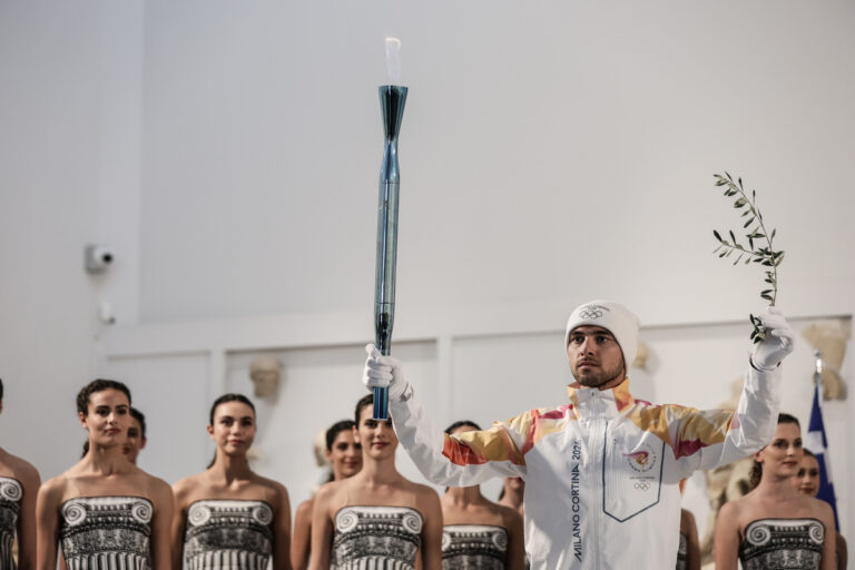 Ο πρώτος λαμπαδηδρόμος Ολυμπιονίκης της κωπηλασίας Πέτρος Γκαιδατζής κρατάει την δάδα με την Ολυμπιακή Φλόγα κατά τη διάρκεια της Τελετής Αφής της Ολυμπιακής Φλόγας των XXV Χειμερινών Ολυμπιακών Αγώνων «Μιλάνο Κορτίνα 2026», στο Αρχαιολογικό Μουσείο της Αρχαίας Ολυμπίας, Τετάρτη 26 Νοεμβρίου 2025. ΑΠΕ-ΜΠΕ/ΠΡΟΕΔΡΙΑ ΤΗΣ ΔΗΜΟΚΡΑΤΙΑΣ/ΘΟΔΩΡΗΣ ΜΑΝΩΛΟΠΟΥΛΟΣ