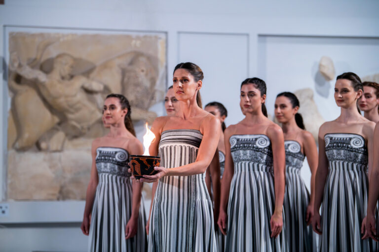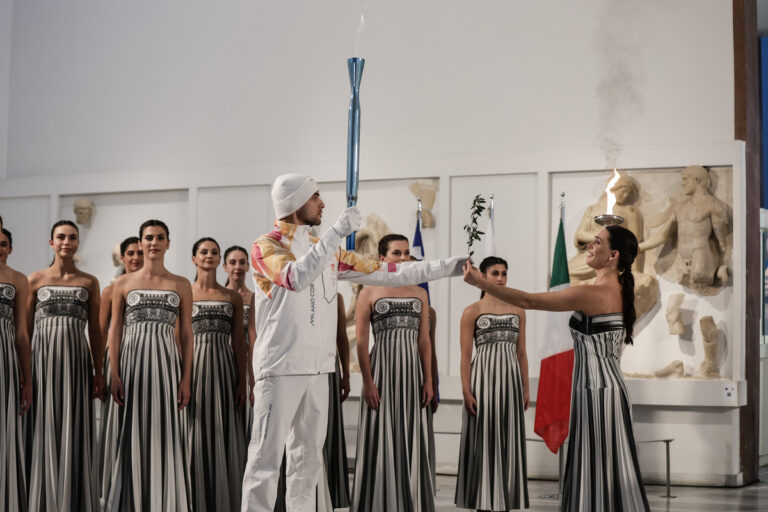 Η ηθοποιός Μαίρη Μηνά στον ρόλο της Πρωθιέρειας παραδίδει την Ολυμπιακή Φλόγα στον πρώτο λαμπαδηδρόμο Ολυμπιονίκη της κωπηλασίας Πέτρο Γκαιδατζή κατά τη διάρκεια της Τελετής Αφής της Ολυμπιακής Φλόγας των XXV Χειμερινών Ολυμπιακών Αγώνων «Μιλάνο Κορτίνα 2026», στο Αρχαιολογικό Μουσείο της Αρχαίας Ολυμπίας, Τετάρτη 26 Νοεμβρίου 2025. ΑΠΕ-ΜΠΕ/ΠΡΟΕΔΡΙΑ ΤΗΣ ΔΗΜΟΚΡΑΤΙΑΣ/ΘΟΔΩΡΗΣ ΜΑΝΩΛΟΠΟΥΛΟΣ