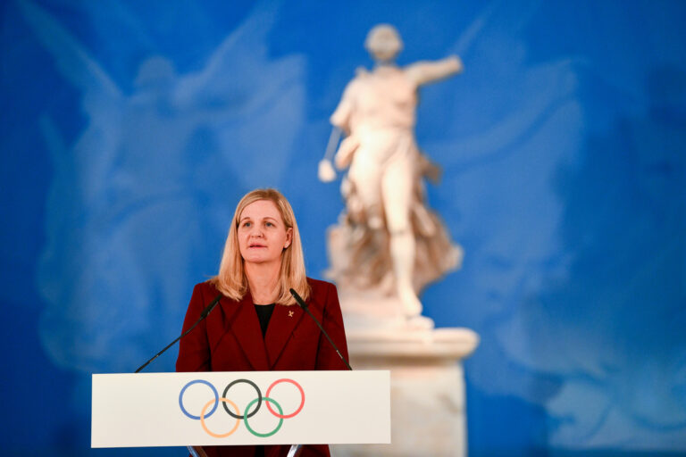 Η πρόεδρος της Διεθνούς Ολυμπιακής Επιτροπής Κίρστι Κόβεντρι μιλάει κατά τη διάρκεια της Τελετής Αφής της Ολυμπιακής Φλόγας των XXV Χειμερινών Ολυμπιακών Αγώνων «Μιλάνο Κορτίνα 2026», στην Αρχαία Ολυμπία, Τετάρτη 26 Νοεμβρίου 2025. ΑΠΕ-ΜΠΕ/Eurokinissi Sports/POOL/ΓΙΑΝΝΗΣ ΣΠΥΡΟΥΝΗΣ