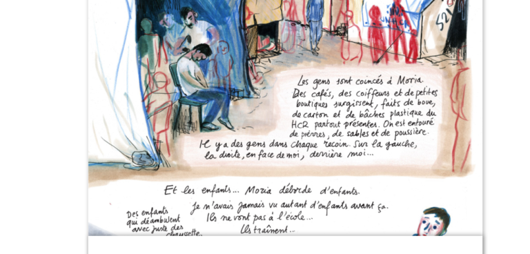Η Τζούντιθ Βανίστεντελ, κομίστας ολλανδικής καταγωγής από το Βέλγιο, κατάφερε να μπει κρυφά στον προσφυγικό καταυλισμό της Μόριας, στην Λέσβο . Στον καταυλισμό αυτό μένουν όσοι πρόσφυγες δεν μπορούν να προωθηθούν από τις υπόλοιπες χώρες της Ευρωπαϊκής Ένωσης και έχει απαγορευτεί η οποιαδήποτε παρουσία του τύπου. Με μόνο όπλο τα μάτια και την μνήμη της, η Βανιστέντελ, κατέγραψε σε ένα συγκλονιστικό κόμικ τα όσα είδε και βίωσε, όση ώρα βρισκόταν εκεί και το δημοσίευσε στην γαλλική εφημερίδα Le Monde.