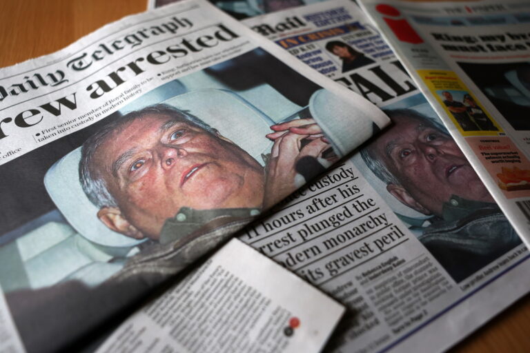 Η βρετανική αστυνομία διεξάγει και σήμερα έρευνα στην έπαυλη του μικρότερου αδελφού του βασιλιά Καρόλου, του Αντριου Μάουντμπάτεν-Γουίνδσορ, ενώ η φωτογραφία ενός ανθρώπου σε σύγχυση που μεταφέρεται στο πίσω κάθισμα αστυνομικού Range Rover μετά την απελευθέρωσή του βρίσκεται στις πρώτες σελίδες των εφημερίδων της Βρετανίας και ολόκληρου του κόσμου.