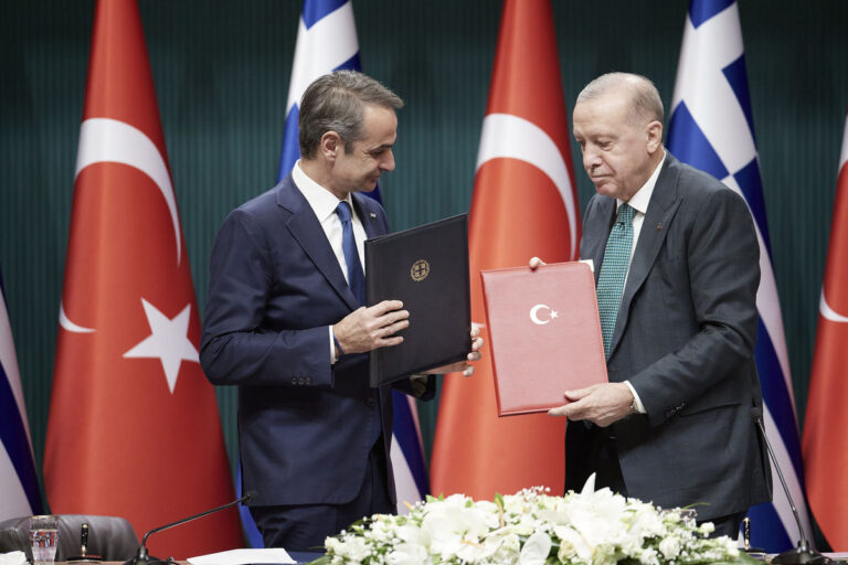 Θα συνεχίσουμε να καταβάλουμε κάθε προσπάθεια για να ανέλθει το αμοιβαίο εμπόριο, είπε ο κ.Ερντογάν, και τόνισε ότι με τον Έλληνα πρωθυπουργό συζήτησαν "για άλλη μια φορά με σαφήνεια και ειλικρίνεια τις θέσεις μας σχετικά με το Αιγαίο και την ανατολική Μεσόγειο". Όπως είπε ο κ.Ερντογάν "εμείς από το παρελθόν μέχρι τώρα υποστηρίζουμε το εξής: παρόλο που τα υφιστάμενα ζητήματα είναι ακανθώδη, δεν είναι άλυτα στη βάση του διεθνούς δικαίου αρκεί να υπάρχει καλή θέληση, εποικοδομητικός διάλογος και βούληση για λύση". Πρόσθεσε ότι "με ικανοποίηση διαπίστωσα ότι συμφωνούμε με τον πολύτιμο μου φίλο Κυριάκο σε αυτό το θέμα. Όπως και σε όλους τους υπόλοιπους τομείς των σχέσεών μας πιστεύουμε ότι από το 2023 και μετά θα σημειωθεί πρόοδος και στην επίλυση των αλληλένδετων προβλημάτων στο Αιγαίο" είπε ο κ.Ερντογάν.