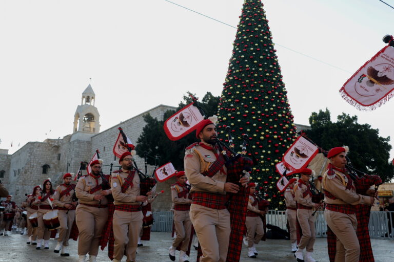 Υπό τους ήχους γκάιντας και τυμπάνων, Παλαιστίνιοι πρόσκοποι παρέλασαν σήμερα στους δρόμους της Βηθλεέμ, στους εορτασμούς που θα γίνουν φέτος τα Χριστούγεννα στην πόλη της Δυτικής Όχθης, λίκνο του Χριστιανισμού, έπειτα από δύο χρόνια χωρίς εορταστικές εκδηλώσεις λόγω του πολέμου στη Λωρίδα της Γάζας.