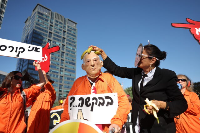 Μικρός αριθμός διαδηλωτών συγκεντρώθηκε σήμερα έξω από το δικαστήριο του Τελ Αβίβ. Ορισμένοι διαδηλωτές φορούσαν πορτοκαλί στολές φυλακής και ζητούσαν τη φυλάκιση του Νετανιάχου.