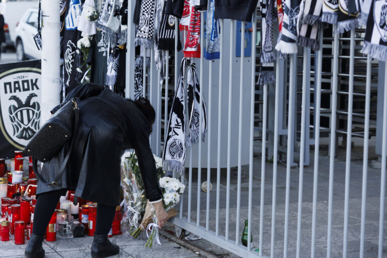 Κεριά, λουλούδια και προσωπικά αντικείμενα αφήνει κόσμος έξω από το γήπεδο της Τούμπας ως συμπαράσταση στους νεκρούς οπαδούς του ΠΑΟΚ σε τροχαίο ατύχημα στη Ρουμανία, Θεσσαλονίκη, Τετάρτη 28 Ιανουαρίου 2026. ΑΠΕ-ΜΠΕ/ΑΧΙΛΛΕΑΣ ΧΗΡΑΣ