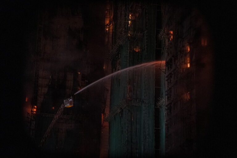 Πυροσβέστες αγωνίζονταν για την κατάσβεση της πυρκαγιάς, ενώ πυκνός μαύρος καπνός υψωνόταν πάνω από τους πύργους των 31 ορόφων, με τις φλόγες να φωτίζουν τον νυχτερινό ουρανό.