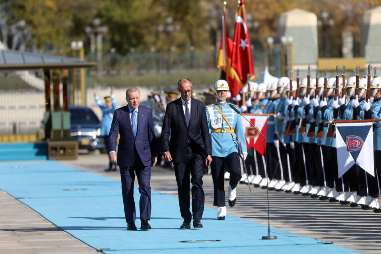 Με κανονιοβολισμούς και έφιππο άγημα υποδέχτηκε την Πέμπτη (30/10) στο προεδρικό μέγαρο στην Άγκυρα τον Γερμανό καγκελάριο Φρίντριχ Μερτς ο Ρετζέπ Ταγίπ Ερντογάν. Οι δύο πλευρές συμφώνησαν στη στενότερη αμυντική συνεργασία, ενώ διαφώνησαν δημοσίως όσον αφορά τον πόλεμο στη Γάζα. Στα ευρωτουρκικά η γερμανική πλευρά δήλωσε ότι θέλει την Τουρκία στην ΕΕ, επισήμανε, όμως, πως «ο δρόμος για την ΕΕ περνάει από τα κριτήρια της Κοπεγχάγης».