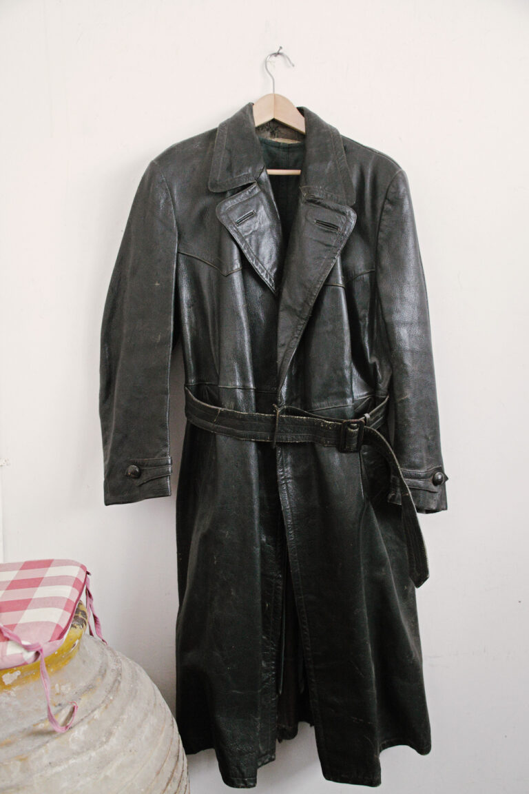 Μαύρη δερμάτινη καμπαρντίνα Έλληνα δωσιλόγου, που δούλευε για την GFP, τη μυστική στρατιωτική γερμανική αστυνομία της Βέρμαχτ. Φτιαγμένη στο Αμβούργο το 1939.