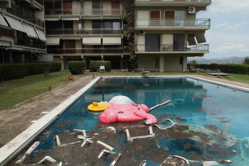Προχωρώντας στο παραλιακό μέτωπο τα resorts στέκουν ανέπαφα, το σταχτί χρώμα που έχουν πάρει τα νερά στις πισίνες είναι άλλη μια ένδειξη τραγικής ειρωνείας. Μερικά σπίτια στέκουν ακόμα, κούφια όμως. Σαν να έχουν μόνο εξωτερικούς χάρτινους τοίχους. Μια ιδιοκτήτρια στο κεφαλόσκαλο, με πλάτη στον δρόμο, σκρολάρει αποκαμωμένη στην οθόνη του smartphone. Αμέσως μετά Κατασκηνώσεις Αγίου Ανδρέα, πρώτη στιγμή ανακούφισης: τα περισσότερα από 600 παιδιά μεταφέρθηκαν έγκαιρα στην Τεχνόπολη, στις 04.30 το πρωί το τελευταίο είχε περάσει τη πόρτα της Πειραιώς. Παράλληλα με τους συνήθεις περίεργους που έκαναν χάζι στα χαλάσματα, η αλληλεγγύη υπήρξε έμπρακτη. Έφηβοι της περιοχής πήραν τους δρόμους μοιράζοντας νερά κι ελαφριά γεύματα. Όταν κάποιος ζητούσε ένα χέρι, η προθυμία έφτανε και περίσσευε.