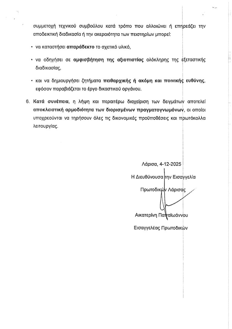 Κατά συνέπεια, η λήψη και περαιτέρω διαχείριση των δειγμάτων αποτελεί αποκλειστική αρμοδιότητα των διορισμένων πραγματογνωμόνων, οι οποίοι υποχρεούνται να τηρήσουν όλες τις δικονομικές προϋποθέσεις και πρωτόκολλα λειτουργίας».