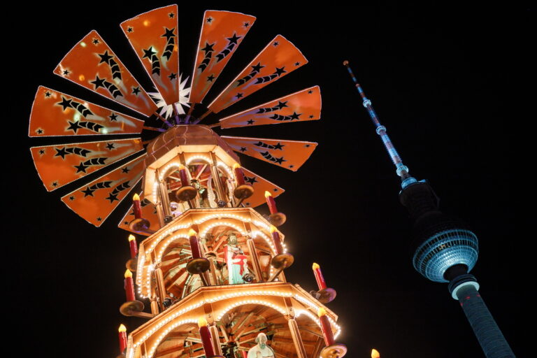 Μια γιγαντιαία χριστουγεννιάτικη πυραμίδα μπροστά από τον Πύργο της Τηλεόρασης στο Βερολίνο.
