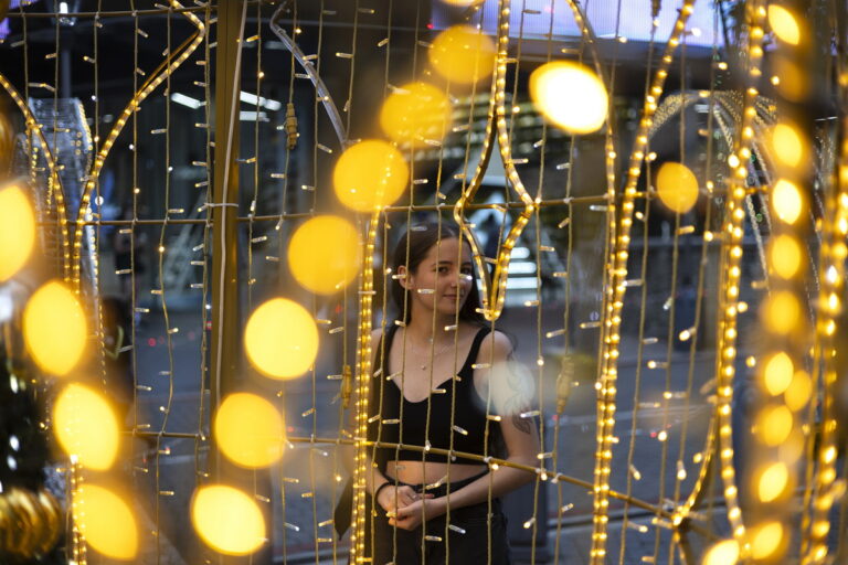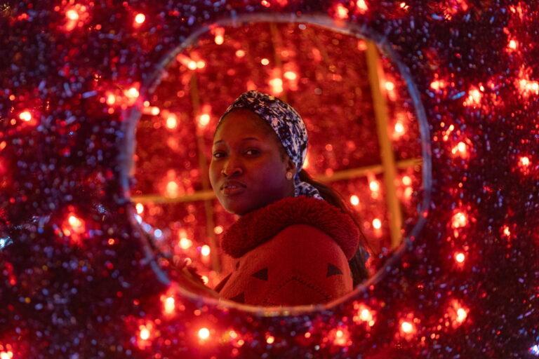 Μια γυναίκα περνάει ανάμεσα από χριστουγεννιάτικα φωτάκια στο κέντρο του Ντακάρ.
