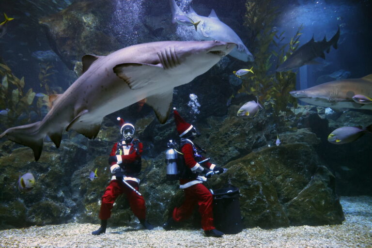Δύτες ντυμένοι Άι Βασίληδες ταΐζουν τους καρχαρίες στο ενυδρείο Sea Life Bangkok στην Μπανγκόκ.
