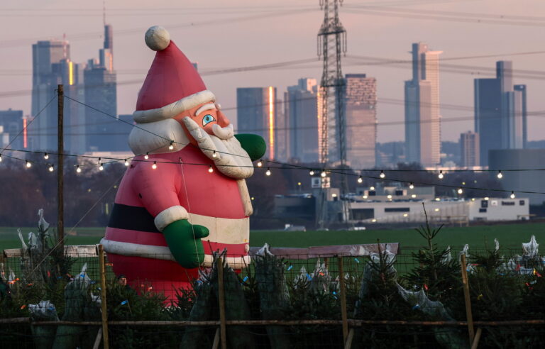 Ένας γιγάντιος φουσκωτός Άι Βασίλης ανάμεσα στα χριστουγεννιάτικα έλατα, με φόντο τους ουρανοξύστες της Φρανκφούρτης.