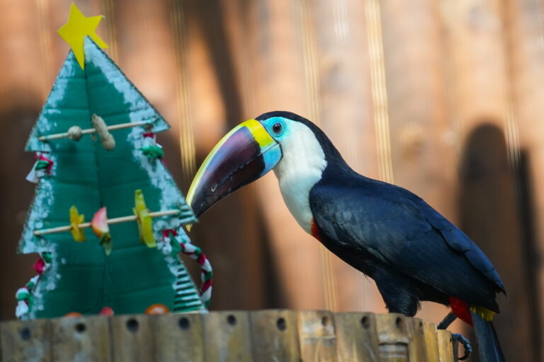 Το εξωτικό τουκάν αναζητά τροφή κρυμμένη στα χριστουγεννιάτικα στολίδια σε έναν ζωολογικό κήπο του Κάλι.