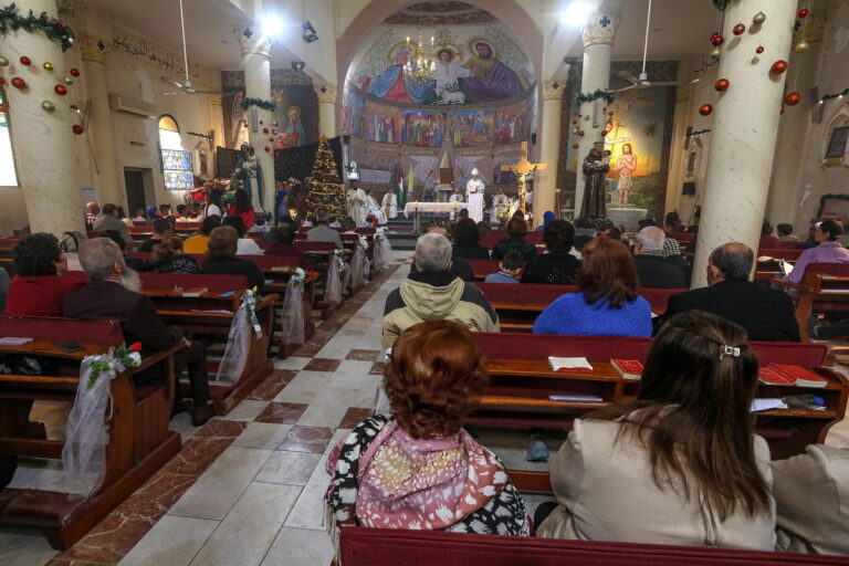 Χριστιανοί Παλαιστίνιοι παρακολουθούν την Κυριακάτικη Λειτουργία που τελεί ο Λατινός Πατριάρχης της Ιερουσαλήμ, πριν από την ημέρα των Χριστουγέννων, στην Λατινική Εκκλησία της πόλης της Γάζας.