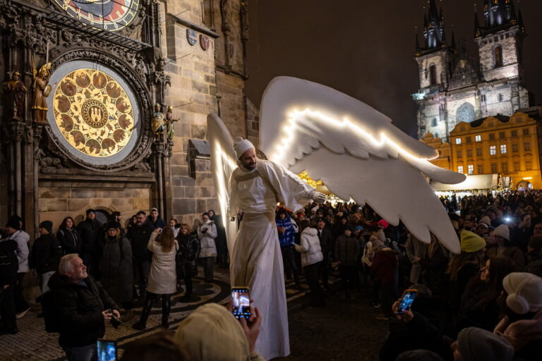Καλλιτέχνης με ξυλοπόδαρα και μεγάλα φτερά αγγέλου δίνει παράσταση στην Πλατεία της Παλιάς Πόλης στην Πράγα.