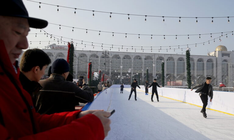 Παιδιά κάνουν πατινάζ στη παγωμένη κεντρική πλατεία στο Μπισκέκ, Κιργιζιστάν, 22 Δεκεμβρίου 2025.