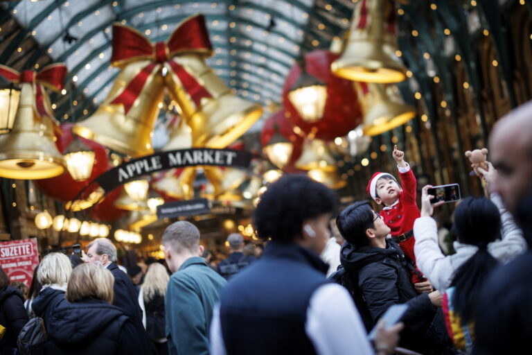 Πλήθος κόσμου επισκέπτεται την αγορά του Κόβεντ Γκάρντεν για να κάνει τα χριστουγεννιάτικα ψώνια, ανάμεσα σε εντυπωσιακές εορταστικές διακοσμήσεις στο Λονδίνο.