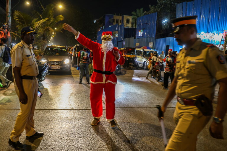 Ανδρας ντυμένος Άι Βασίλης χορεύει στους δρόμους, λίγες ημέρες πριν από τις διακοπές των Χριστουγέννων στη Βομβάη της Ινδίας.