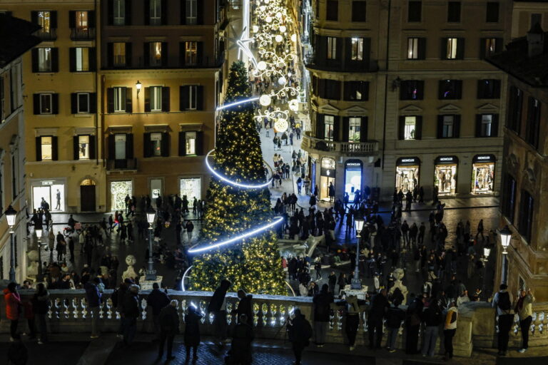 Άνθρωποι περπατούν στη χριστουγεννιάτικα διακοσμημένη Via dei Condotti, Ρώμη.