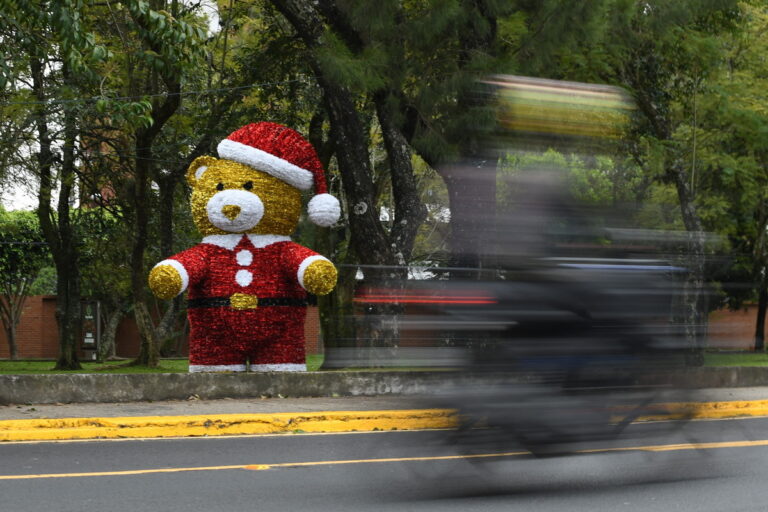 Αρκούδος-γλυπτό ντυμένος Άι Βασίλης βρίσκεται τοποθετημένος στην άκρη κεντρικού δρόμου, δημιουργώντας χριστουγεννιάτικη ατμόσφαιρα στην Πόλη της Γουατεμάλας.