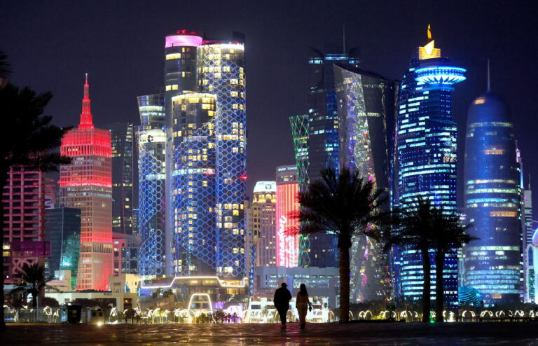 Ένα ζευγάρι περπατά μπροστά από το εντυπωσιακά φωτισμένο skyline της Ντόχα, Κατάρ, 28 Φεβρουαρίου 2026. EPA/HANNIBAL HANSCHKE