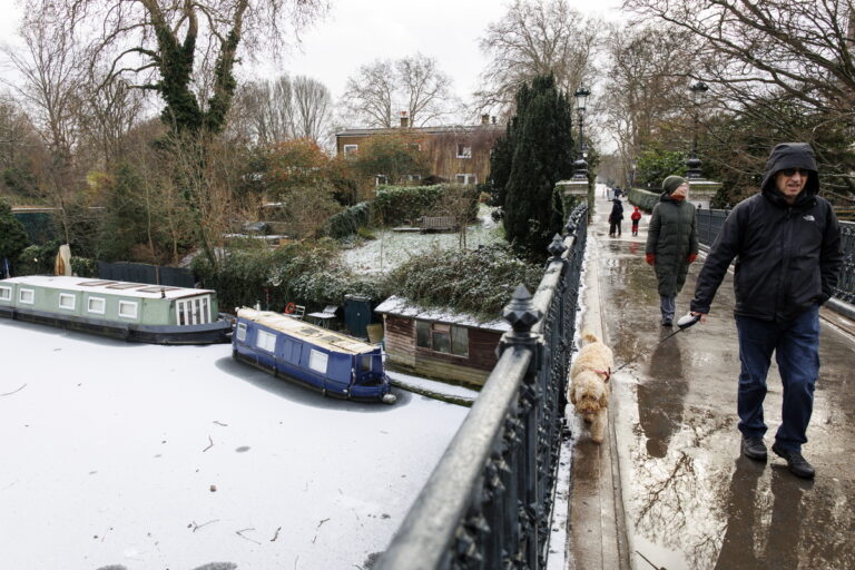 Αντρας κάνει βόλτα με τον σκύλο του δίπλα στο παγωμένο Regent's Canal στο Regent's Park, Λονδίνο, 6 Ιανουαρίου 2026.