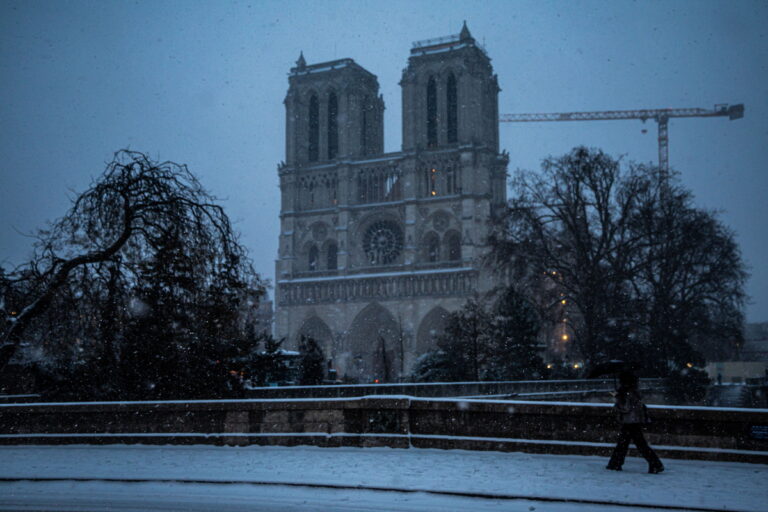 Άνθρωποι περπατούν μπροστά από τον καθεδρικό ναό της Νοτρ Νταμ κατά τη διάρκεια πρωινής χιονόπτωσης στο Παρίσι, στις 7 Ιανουαρίου 2026. EPA/CHRISTOPHE PETIT TESSON